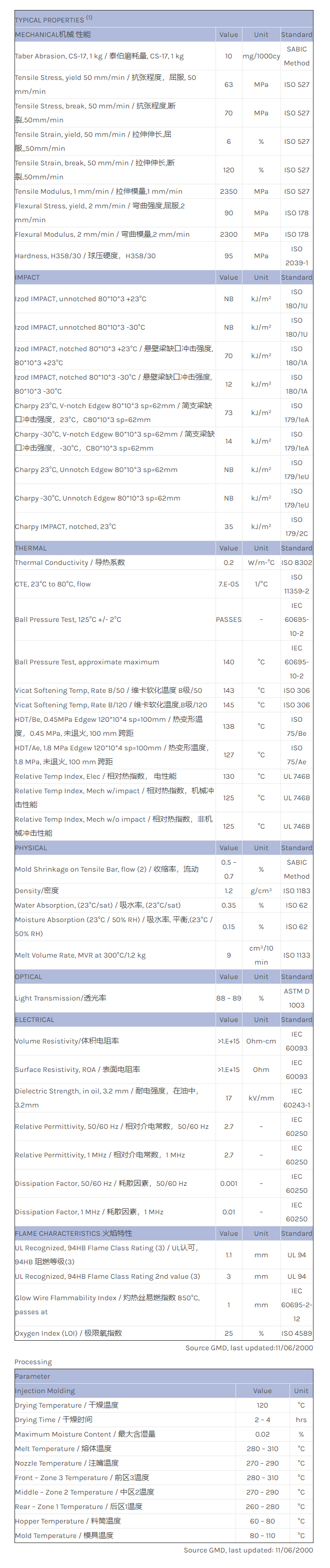 应用范围: 产品描述 LEXAN PC 161物性表 LEXAN 161 is a medium viscosity multi purpose grade available in transparent, translucent and opaque colours.