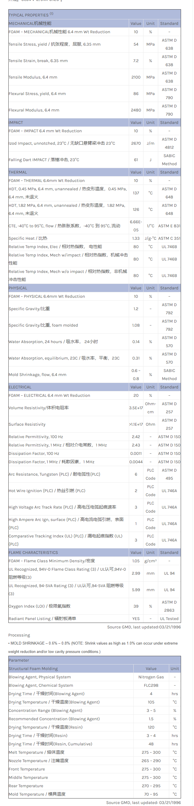 壁厚0.250″(6.35mm)时的各类减重。耐紫外性、抗冲击、优良的可加工性能、优异的表面外观。UL94 V-0/5VA-0.125″。