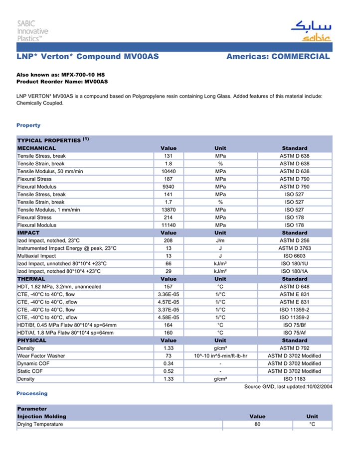 江门LNP VERTON MV00AS是一种聚丙烯材料,含有的填充物为长玻璃纤维,加工方式为:注射成型。