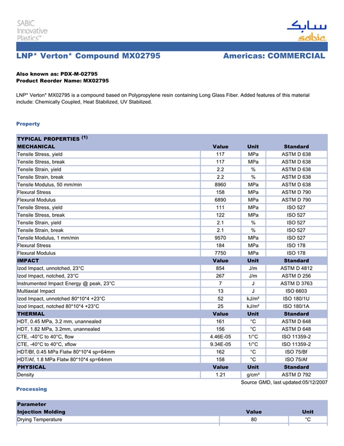 应用范围:产品描述LNP VERTON MX02795物性表LNP VERTON MX02795是一种聚丙烯材料,含有的填充物为长玻璃纤维。LNP VERTON MX02795的主要特性有:化学耦合热稳定剂紫外线稳定