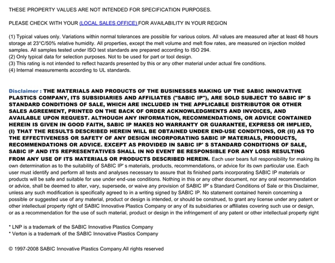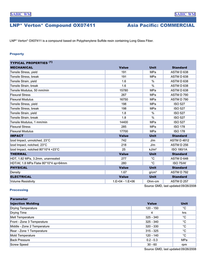 应用范围:产品描述LNP VERTON OX07411物性表LNP* Verton* OX07411 is a compound based on Polyphenylene Sulfide resin containing Long Glass Fiber.