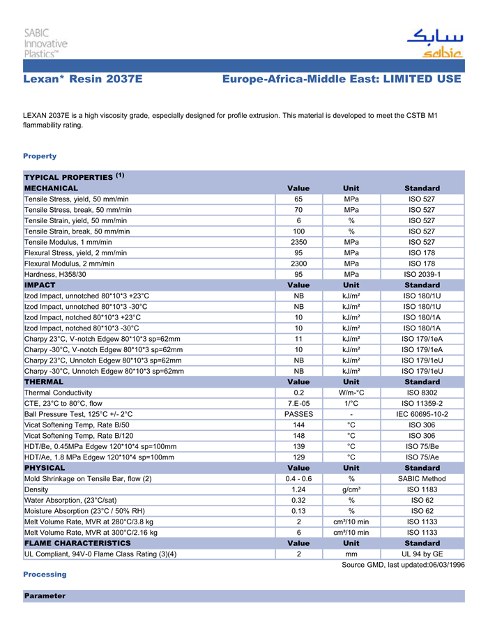LEXAN 2037E is a high viscosity grade, especially designed for profile extrusion. This material is developed to meet the CSTB M1 flammability rating.