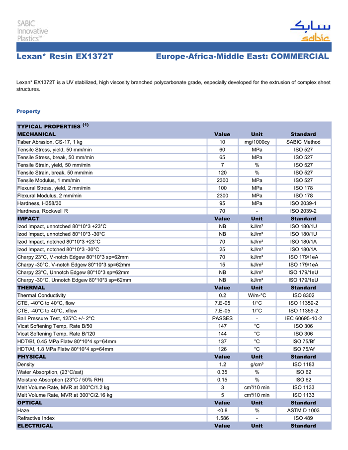LEXAN PC EX1372T物性表