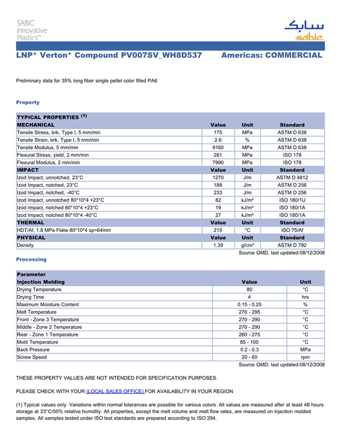 应用范围:产品描述LNP VERTON PV007SV_WH8D537物性表Preliminary data for 35% long fiber single pellet color filled PA6