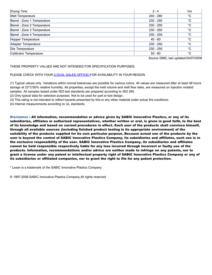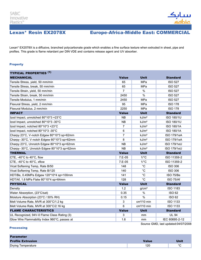 应用范围:产品描述LEXAN PC EX2078X物性表Lexan* EX2078X is a diffusive, branched polycarbonate grade which enables a fine surface texture when extruded in sheet, pipe and profiles. This grade is flame retardant per DIN