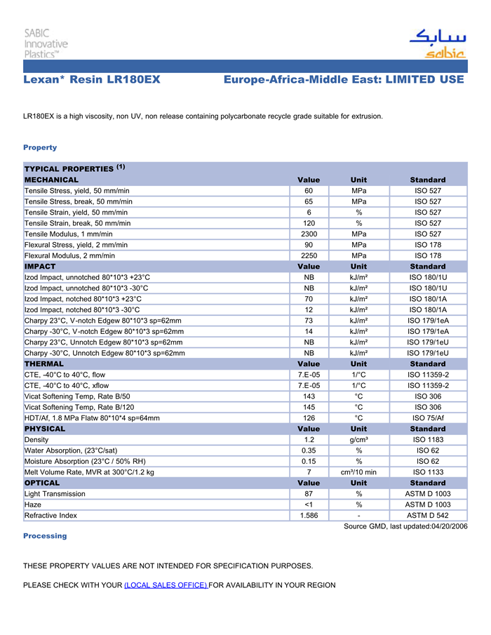 应用范围:产品描述LEXAN PC LR180EX物性表LR180EX is a high viscosity, non UV, non release containing polycarbonate recycle grade suitable for extrusion.