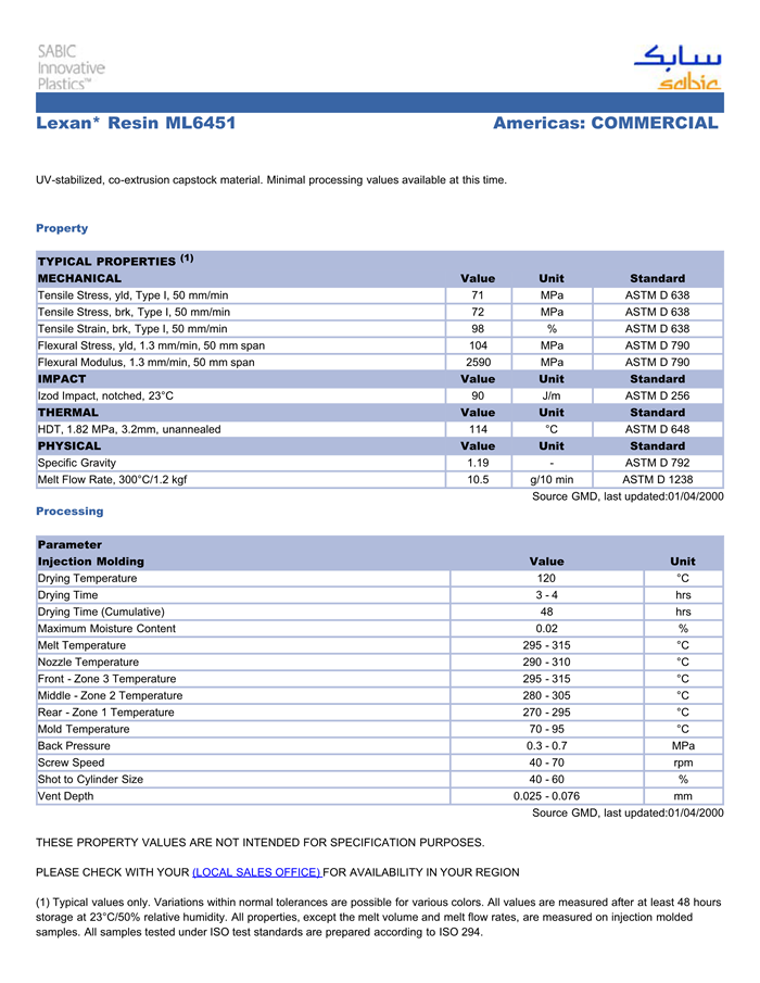 LEXAN PC ML6451物性表