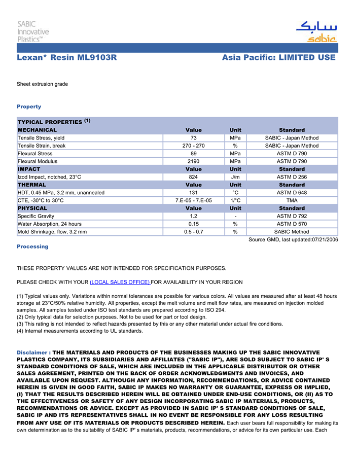 应用范围:产品描述LEXAN PC ML9103R物性表Lexan ML9103R resin是一种聚碳酸酯(PC)材料,该产品在亚太地区有供货。典型应用领域为:薄板