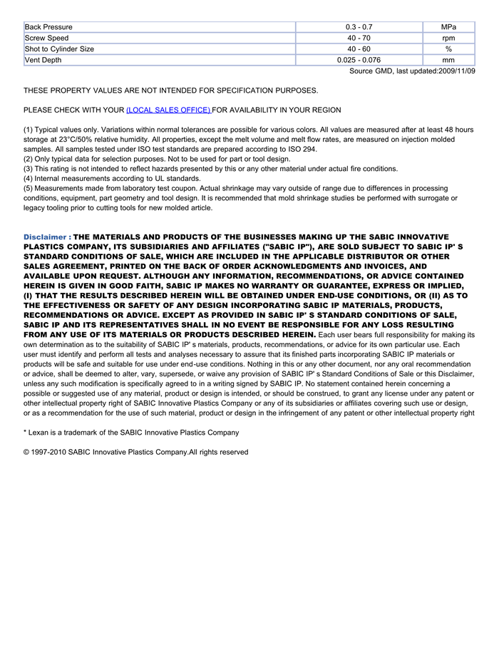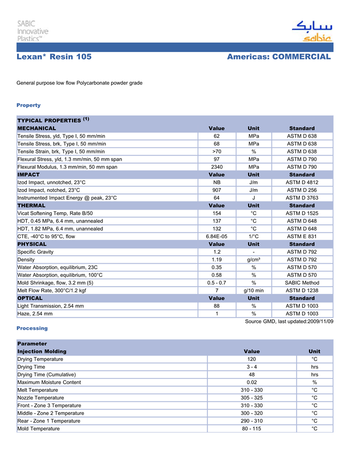 应用范围:产品描述LEXAN PC 105物性表Lexan 105 resin是一种聚碳酸酯(PC)产品,它可以通过注射成型进行加工,在北美洲有供货。特性包括:均聚物、线性聚合物结构