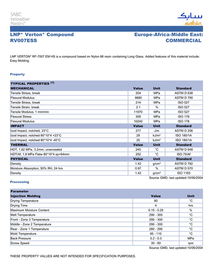 应用范围: LNP Verton RV007ESS物性表 “LNP VERTON RV007ESS是一种聚酰胺66(尼龙66)材料,含有的填充物为长玻璃纤维,加工方式为:注射成型。 LNP VERTON RV007ESS的主要特性有: 通过ROHS认证 加工性能良好” LNP VERTON* RF-7007 EM HS is a compound based on Nylon 66 resin