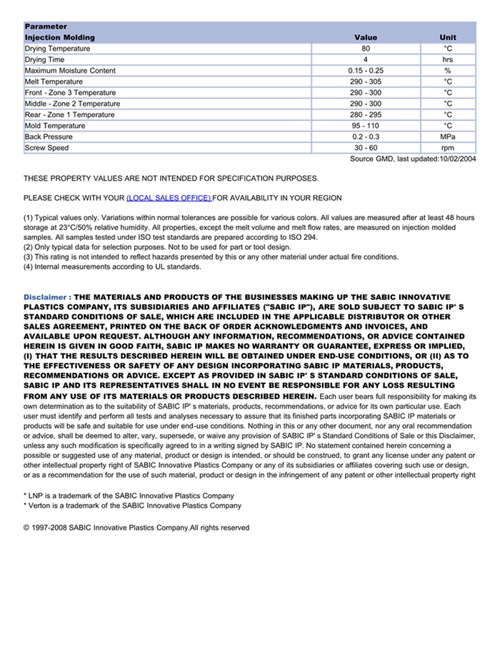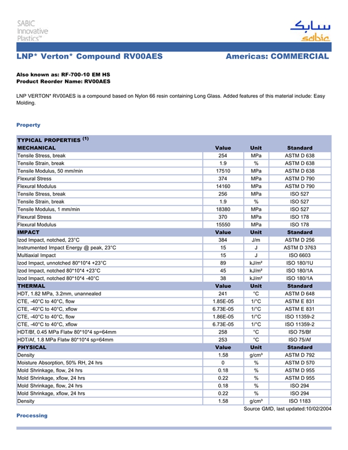 应用范围: 产品描述 LNP Verton RV00AES物性表 “LNP VERTON RV00AES是一种聚酰胺66(尼龙66)材料,含有的填充物为长玻璃纤维,加工方式为:注射成型。 LNP VERTON RV00AES的主要特性为:加工性能良好。” 相关颜色色号:RV00AES-GYMDNAT LNP VERTON* RV00AES is a compound based on Nylon