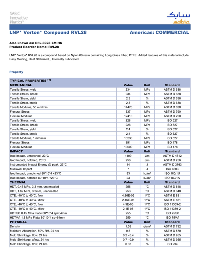 LNP* Verton* RVL28 is a compound based on Nylon 66 resin containing Long Glass Fiber, PTFE. Added features of this material include: Easy Molding, Heat Stabilized, , Internally Lubricated.