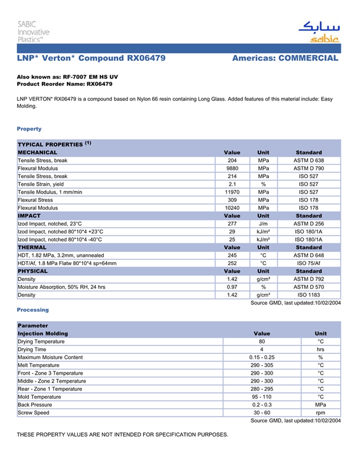 应用范围: 产品描述 LNP Verton RX06097物性表 “LNP VERTON RX06097是一种聚酰胺66(尼龙66)材料,含有的填充物为长玻璃纤维,加工方式为:注射成型。 LNP VERTON RX06097的主要特性有: 通过ROHS认证 加工性能良好 紫外线稳定” LNP* VERTON* RX06097 is a compound based on PA 66 resi