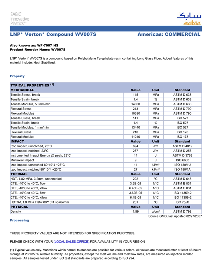 应用范围: 产品描述 LNP VERTON WV007S物性表 LNP* Verton* WV007S is a compound based on Polybutylene Terephalate resin containing Long Glass Fiber. Added features of this material include: Heat Stabilized.