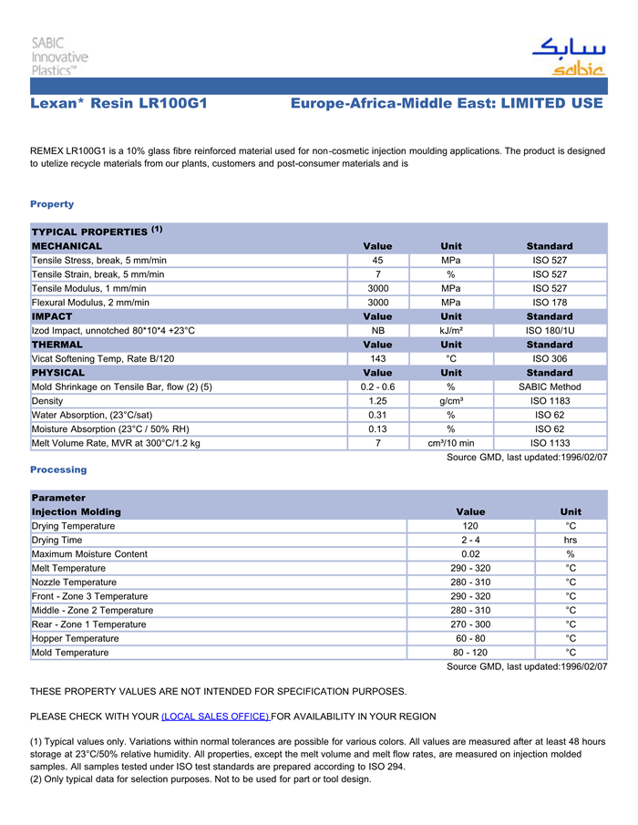 应用范围:产品描述LEXAN PC LR100G1物性表REMEX LR100G1 is a 10% glass fibre reinforced material used for non-cosmetic injection moulding applications. The product is designed to utelize recycle materials from our plant