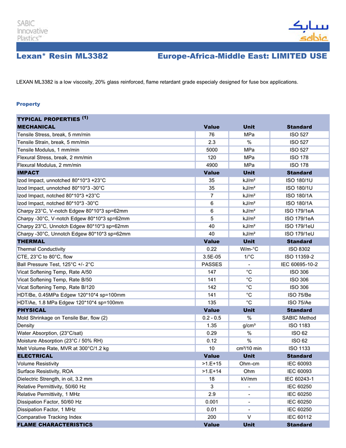 LEXAN ML3382 is a low viscosity, 20% glass reinforced, flame retardant grade especialy designed for fuse box applications.