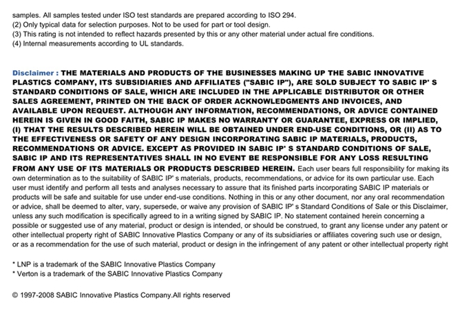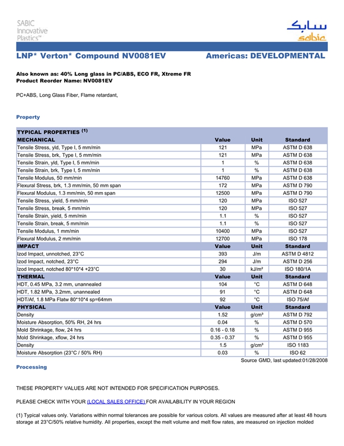 应用范围: 产品描述 LNP Verton NV008E物性表 “LNP VERTON NV008E是一种聚碳酸酯+丙烯腈丁二烯苯乙烯(PC+ABS)材料,含有的填充物为长玻璃纤维。 LNP VERTON NV008E的主要特性为:加工性能良好。” LNP* Verton* NV008E is a compound based on PC/ABS resin containing Long Gla