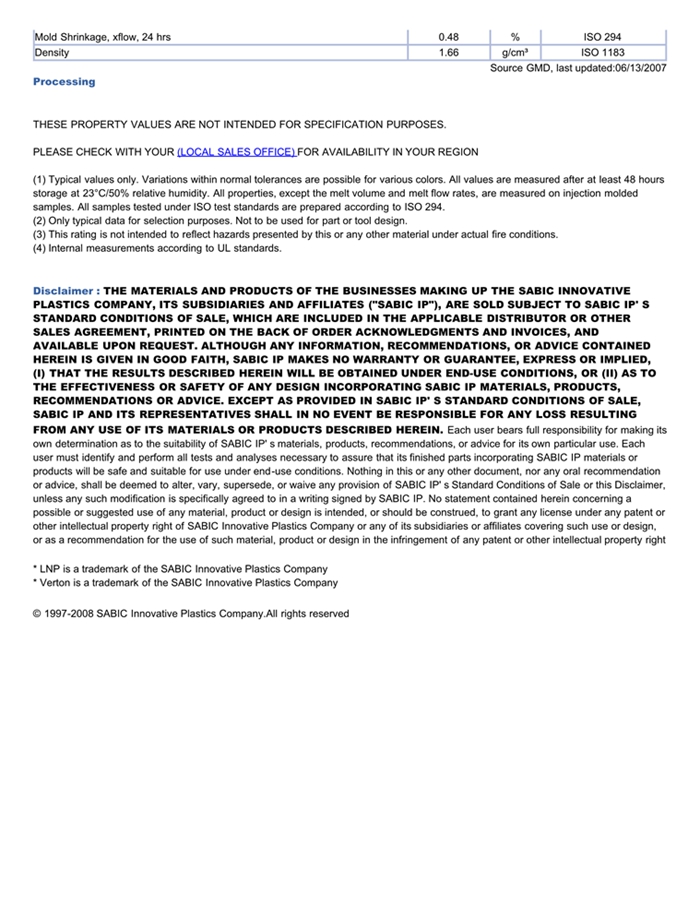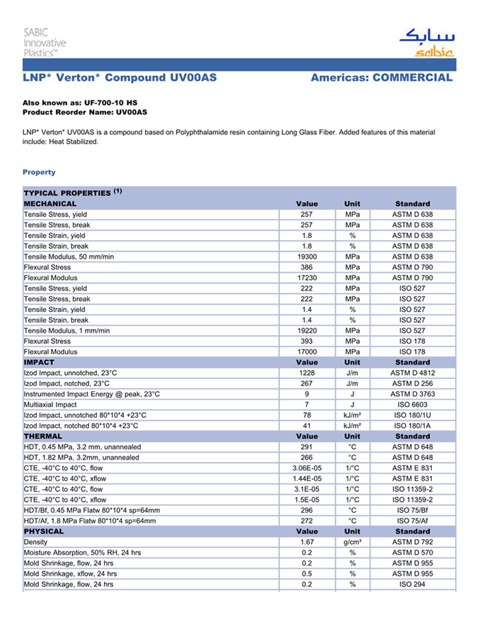 应用范围: 产品描述 LNP Verton UV00AS物性表 “LNP VERTON UV00AS是一种聚二甲苯酰胺(PPA)材料,含有的填充物为长玻璃纤维。 LNP VERTON UV00AS的主要特性为:热稳定剂。” LNP* Verton* UV00AS is a compound based on Polyphthalamide resin containing Long Glass F