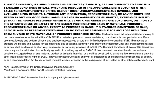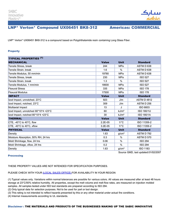 应用范围: 产品描述 LNP Verton UX06451 BK8-312物性表 LNP VERTON UX06451 BK8-312是一种聚二甲苯酰胺(PPA)材料,含有的填充物为长玻璃纤维。 LNP* Verton* UX06451 BK8-312 is a compound based on Polyphthalamide resin containing Long Glass Fiber.