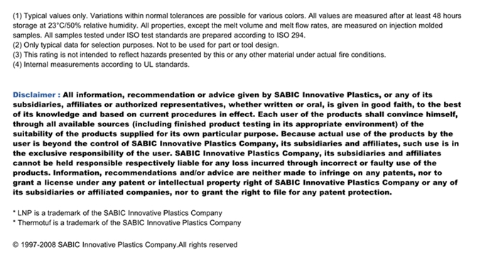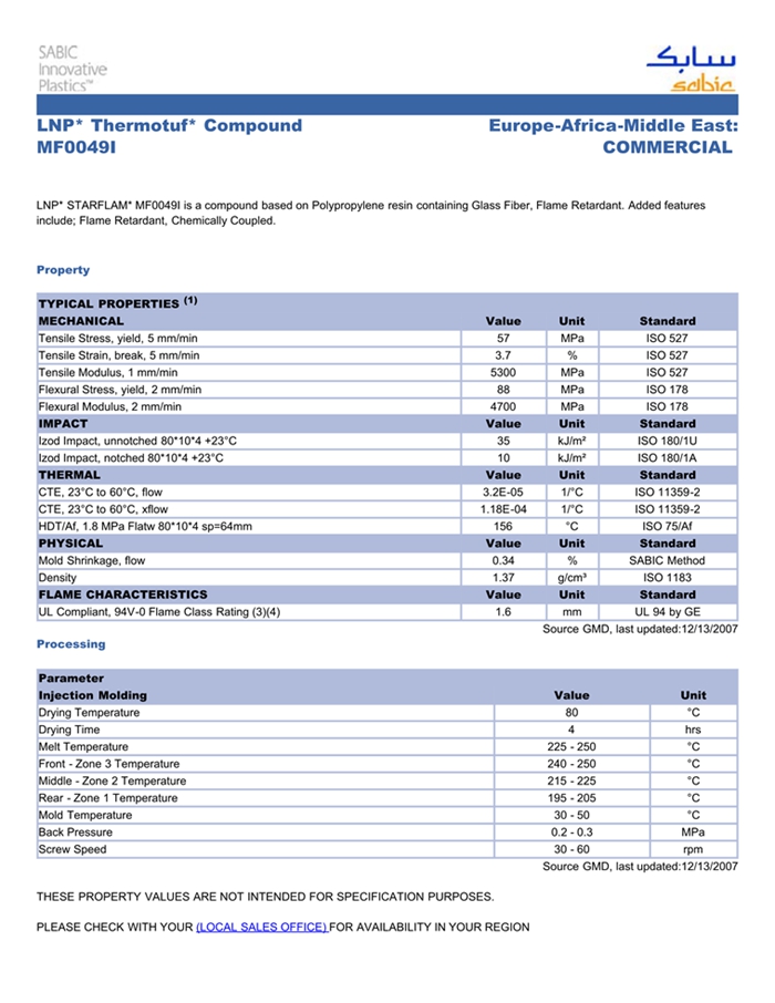 应用范围: 产品描述 LNP THERMOTUF MF0049I物性表 LNP THERMOTUF MF0049I是一种聚丙烯材料,含有的填充物为玻璃纤维增强材料,加工方式为:注射成型。 LNP THERMOTUF MF0049I的主要特性有: 阻燃/额定火焰 通过ROHS认证 Flame Retardant