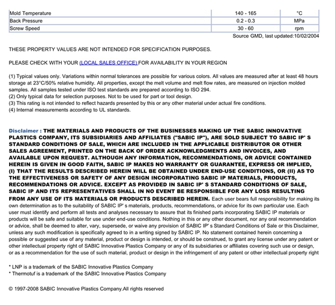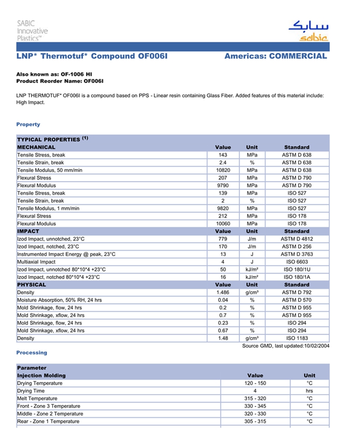 应用范围: 产品描述 LNP THERMOTUF OF006I物性表 LNP THERMOTUF OF006I是一种线性聚苯硫醚产品,含有的填充物为玻璃纤维增强材料,可以通过注射成型进行加工。 特性包括: 耐冲击 线性聚合物结构