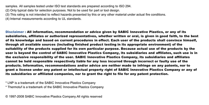应用范围: 产品描述 LNP THERMOTUF OF008EI物性表 LNP THERMOTUF OF008EI是一种聚苯硫醚(PPS)材料,含有的填充物为玻璃纤维增强材料,加工方式为:注射成型。 LNP THERMOTUF OF008EI的主要特性有: 通过ROHS认证 加工性能良好