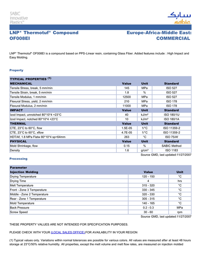 江门LNP THERMOTUF OF008EI是一种聚苯硫醚(PPS)材料,含有的填充物为玻璃纤维增强材料,加工方式为:注射成型。