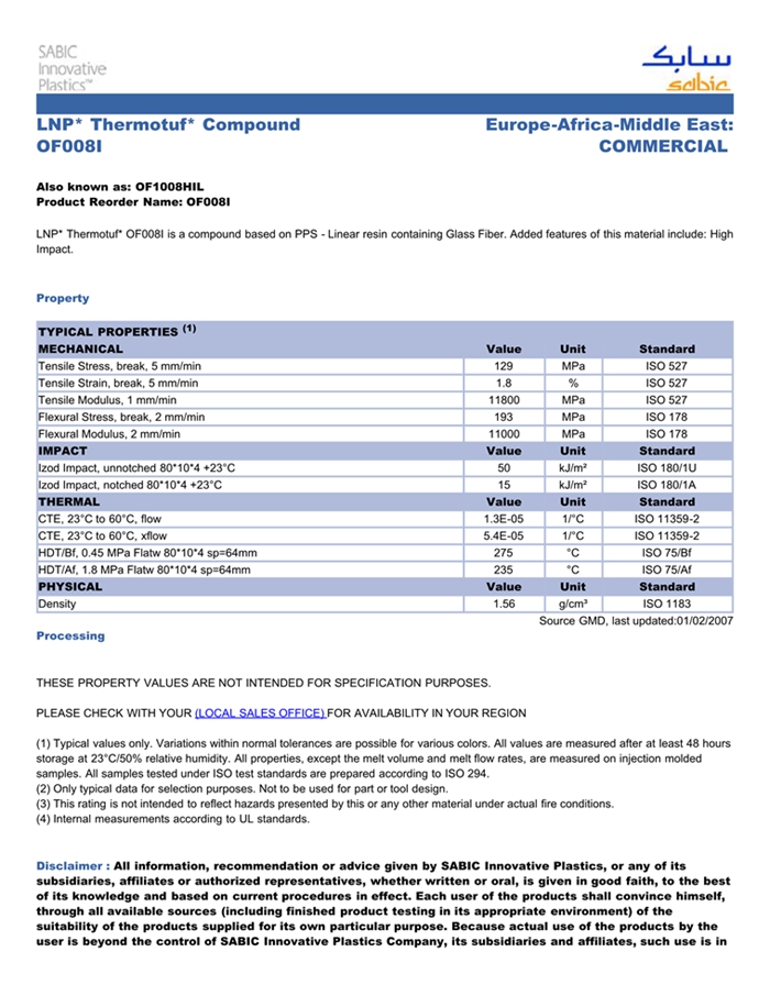应用范围:产品描述LNP THERMOTUF OF008I物性表LNP THERMOTUF OF008I是一种线性聚苯硫醚材料,含有的填充物为玻璃纤维增强材料。LNP THERMOTUF OF008I的主要特性有:通过ROHS认证耐冲击线性聚合物结构