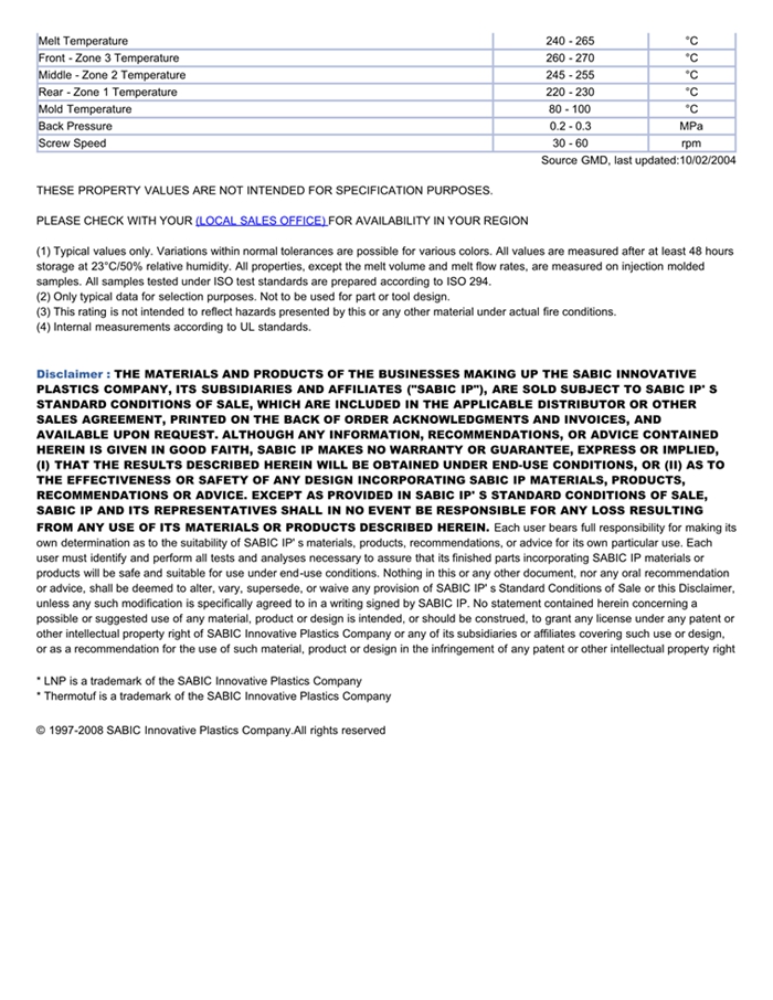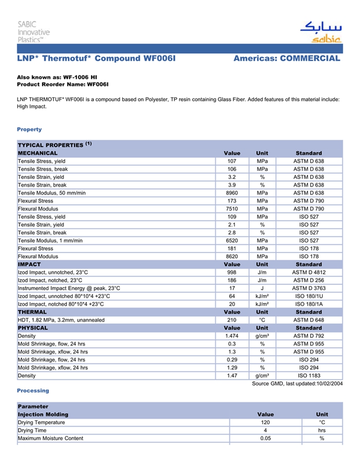 应用范围:产品描述LNP THERMOTUF WF006I物性表LNP THERMOTUF WF006I是一种聚丁烯对苯二甲酸酯(PBT)产品,含有的填充物为30%玻璃纤维增强材料,可以通过注射成型进行加工。主要特性为:耐冲击。