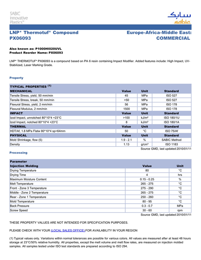 LNP* THERMOTUF* PX06093 is a compound based on PA 6 resin containing Impact Modifier. Added features include: High Impact, UV-Stabilized, Laser Marking Grade.