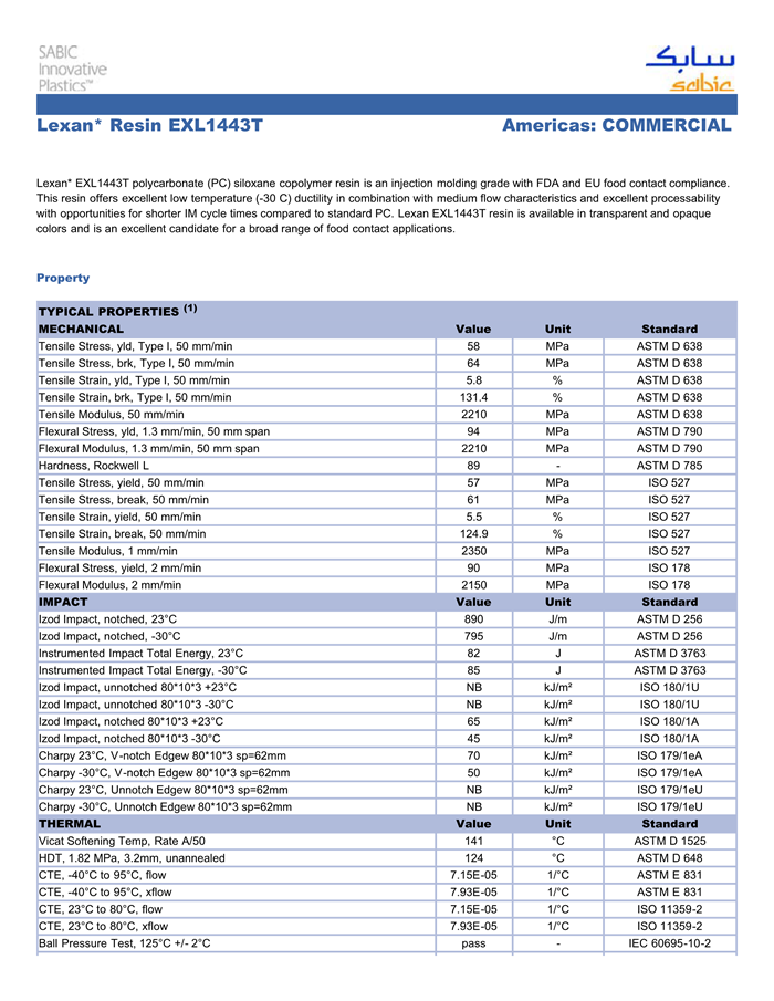 Lexan* EXL1443T polycarbonate (PC) siloxane copolymer resin is an injection molding grade with FDA and EU food contact compliance. This resin offers excellent low temperature (-30 C) ductility in combination with medium flow characteristics and excellent processability with opportunities for shorter IM cycle times compared to standard PC. Lexan EXL1443T resin is available in transparent and opaque colors and is an excellent candidate for a broad range of food contact applications.