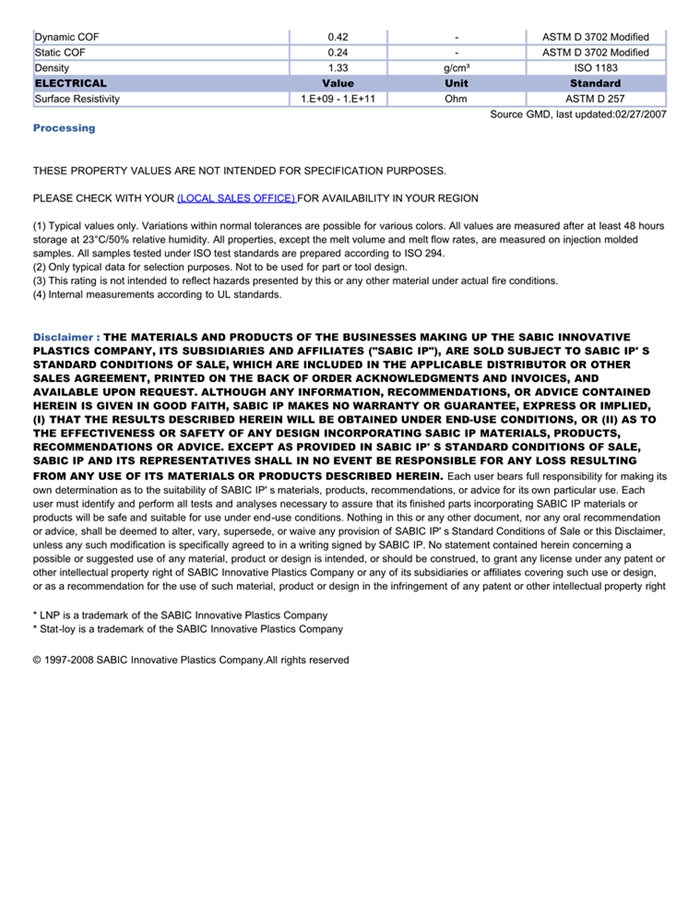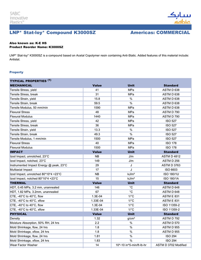 应用范围:产品描述LNP STATLOY K3000SZ物性表LNP STAT-LOY K3000SZ是一种聚甲醛(POM)共聚物材料。LNP STAT-LOY K3000SZ的主要特性为:抗静电。