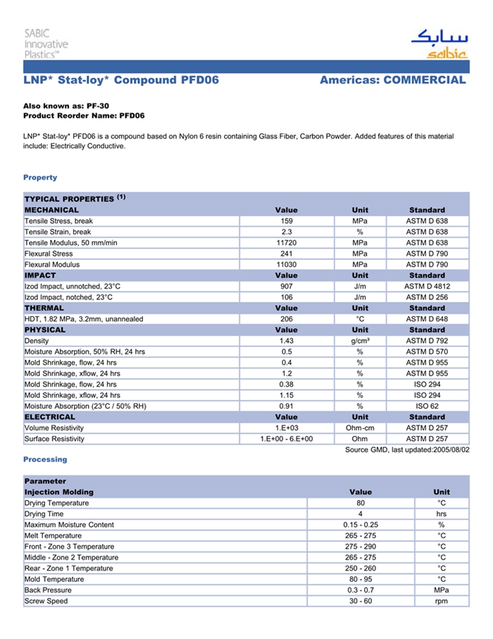 应用范围: 产品描述 LNP STATLOY PFD06物性表 LNP* Stat-loy* PFD06 is a compound based on Nylon 6 resin containing Glass Fiber, Carbon Powder. Added features of this material include: Electrically Conductive.