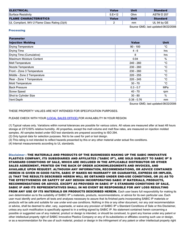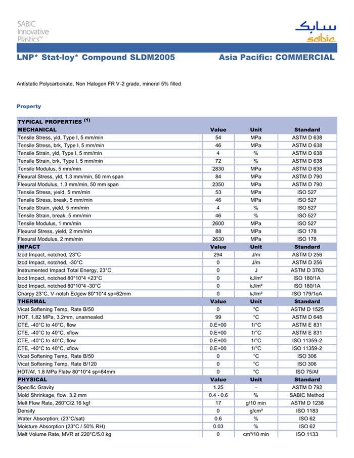 应用范围: 产品描述 LNP STATLOY SLDM2005物性表 LNP STAT-LOY SLDM2005是一种聚碳酸酯(PC)材料,含有的填充物为5.0%矿物填料,加工方式为:注射成型。 LNP STAT-LOY SLDM2005的主要特性有: 阻燃/额定火焰 Flame Retardant
