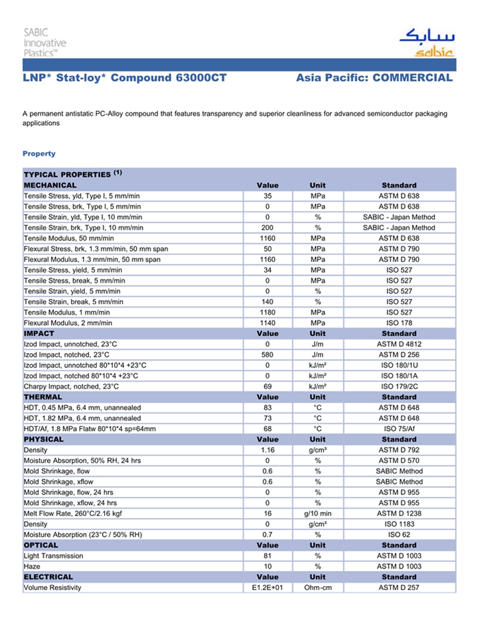 应用范围: 产品描述 LNP Statloy 63000CT物性表 “LNP STAT-LOY 63000CT是一种聚碳酸脂+聚酯(PC+聚酯)材料,加工方式为:注射成型。 LNP STAT-LOY 63000CT的典型应用领域为:包装” A permanent antistatic PC-Alloy compound that features transparency and superior
