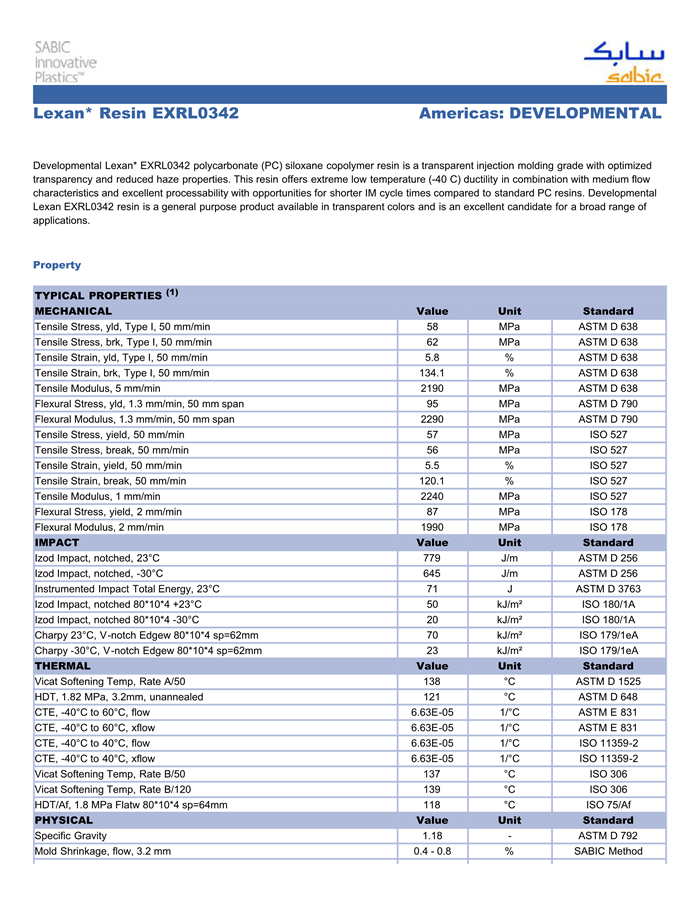 Developmental Lexan* EXRL0342 polycarbonate (PC) siloxane copolymer resin is a transparent injection molding grade with optimized transparency and reduced Haze/雾度properties. This resin offers extreme low temperature (-40 C) ductility in combination with medium flow characteristics and excellent processability with opportunities for shorter IM cycle times compared to standard PC resins. Developmental Lexan EXRL0342 resin is a general purpose product available in transparent colors and is an excellent candidate for a broad range of applications.
