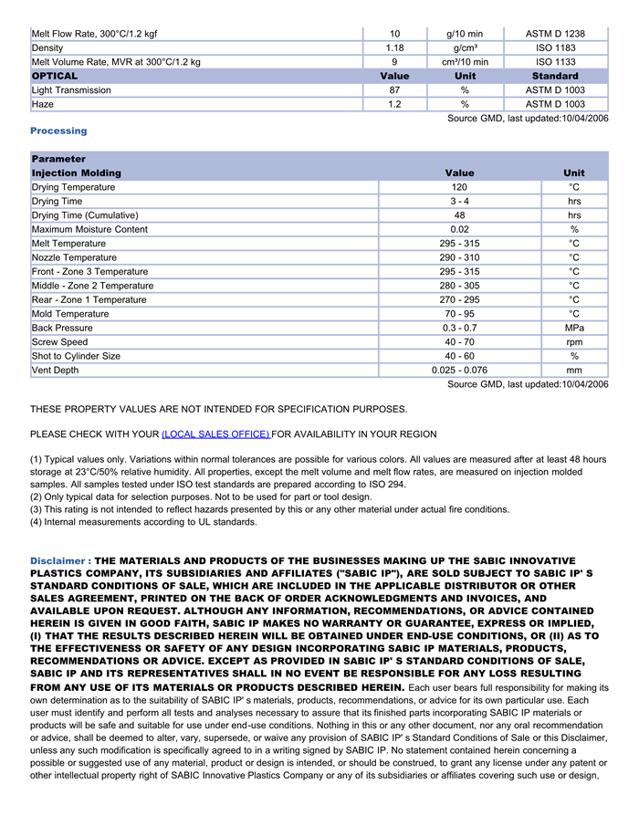 应用范围:产品描述LEXAN PC EXRL0342物性表Developmental Lexan* EXRL0342 polycarbonate (PC) siloxane copolymer resin is a transparent injection molding grade with optimized transparency and reduced Haze/雾度properties. Th