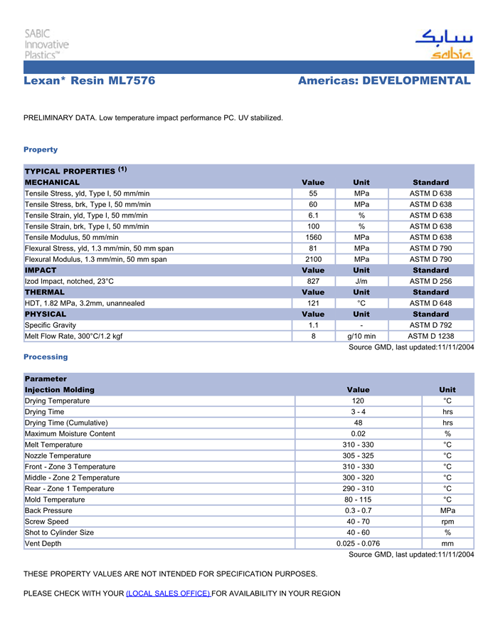 应用范围:产品描述LEXAN PC ML7576物性表PRELIMINARY DATA. Low temperature IMPACT performance PC. UV stabilized.