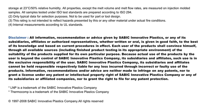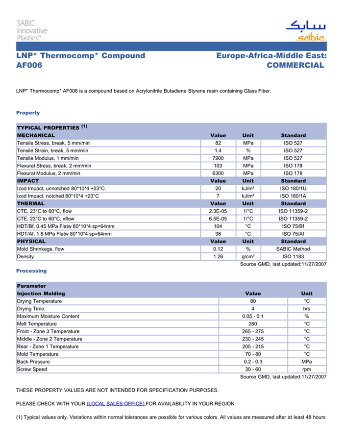 应用范围: 产品描述 LNP Thermocomp AF006物性表 “LNP THERMOCOMP AF006是一种丙烯腈丁二烯苯乙烯(ABS)材料,含有的填充物为玻璃纤维增强材料,加工方式为:注射成型。 LNP THERMOCOMP AF006的主要特性为:通过ROHS认证。” LNP* Thermocomp* AF006 is a compound based on Acrylonitril