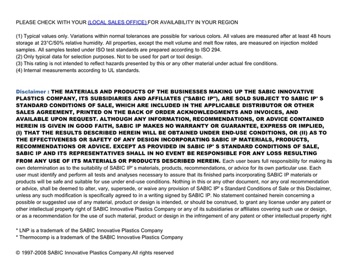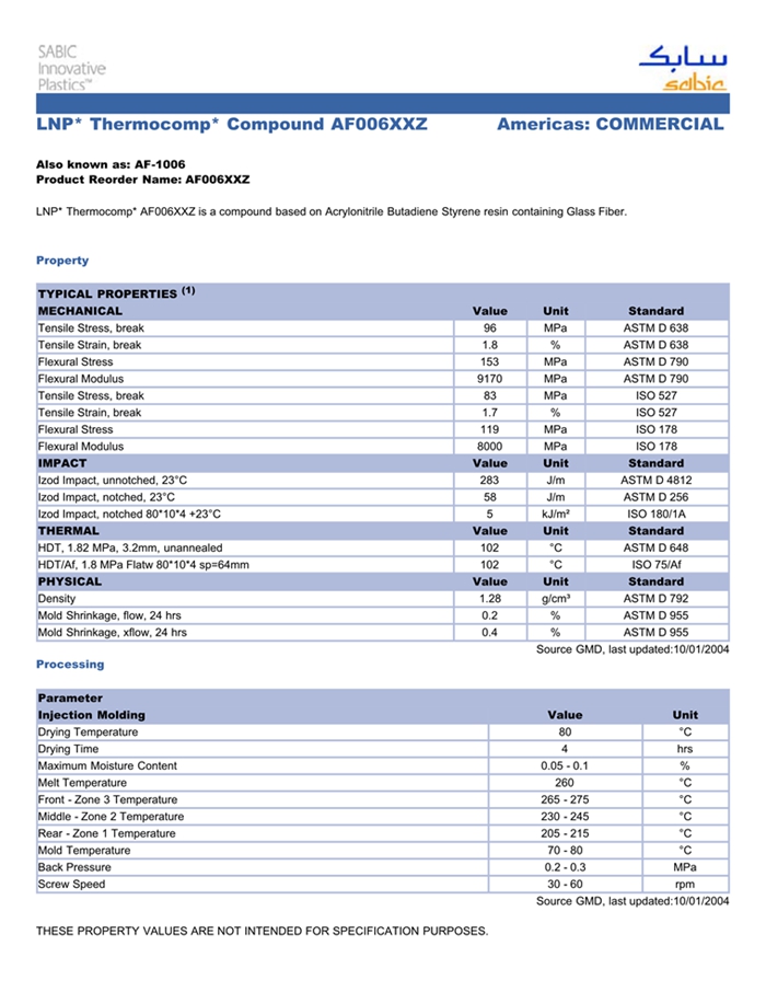 应用范围: 产品描述 LNP Thermocomp AF006XXZ物性表 LNP THERMOCOMP AF006XXZ是一种丙烯腈丁二烯苯乙烯(ABS)产品,含有的填充物为30%玻璃纤维增强材料,可以通过注射成型进行加工。 LNP* Thermocomp* AF006XXZ is a compound based on Acrylonitrile Butadiene Styrene resin