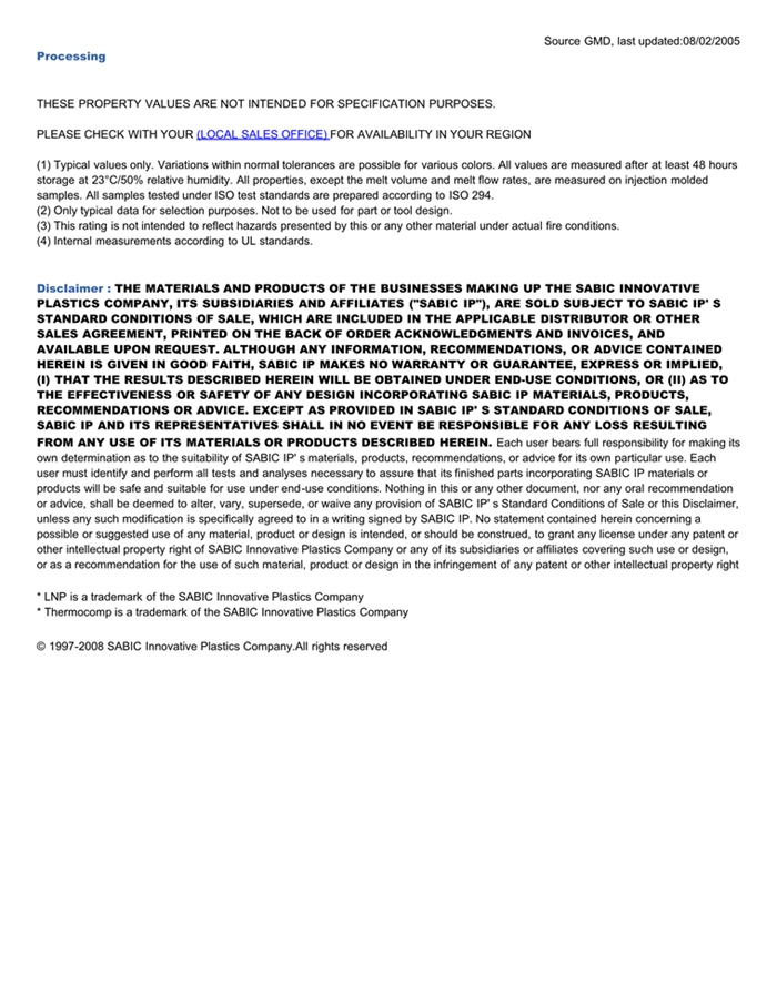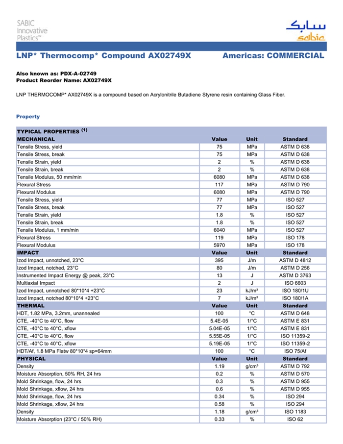 应用范围: 产品描述 LNP Thermocomp AX02749物性表 LNP THERMOCOMP AX02749是一种丙烯腈丁二烯苯乙烯(ABS)产品,含有的填充物为专有填料,可以通过注射成型进行加工。 LNP* Thermocomp* AX02749 is a compound based on ABS containing proprietary fillers. Property/特性