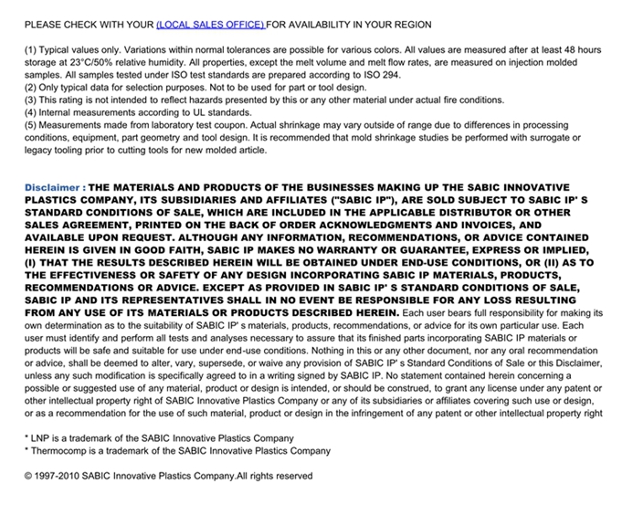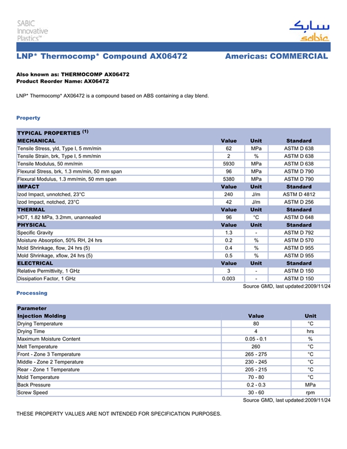 应用范围: 产品描述 LNP Thermocomp AX06472物性表 LNP THERMOCOMP AX06472是一种丙烯腈丁二烯苯乙烯(ABS)产品,含有的填充物为粘土填料,可以通过注射成型进行加工。 LNP* Thermocomp* AX06472 is a compound based on ABS containing a clay blend. Property/特性