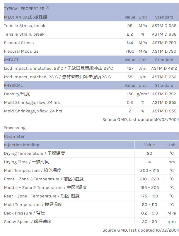 应用范围: 产品描述 LNP THERMOCOMP KF004A物性表 LNP THERMOCOMP KF004A是一种聚甲醛(POM)均聚物产品,含有的填充物为20%玻璃纤维增强材料,可以通过注射成型进行加工。