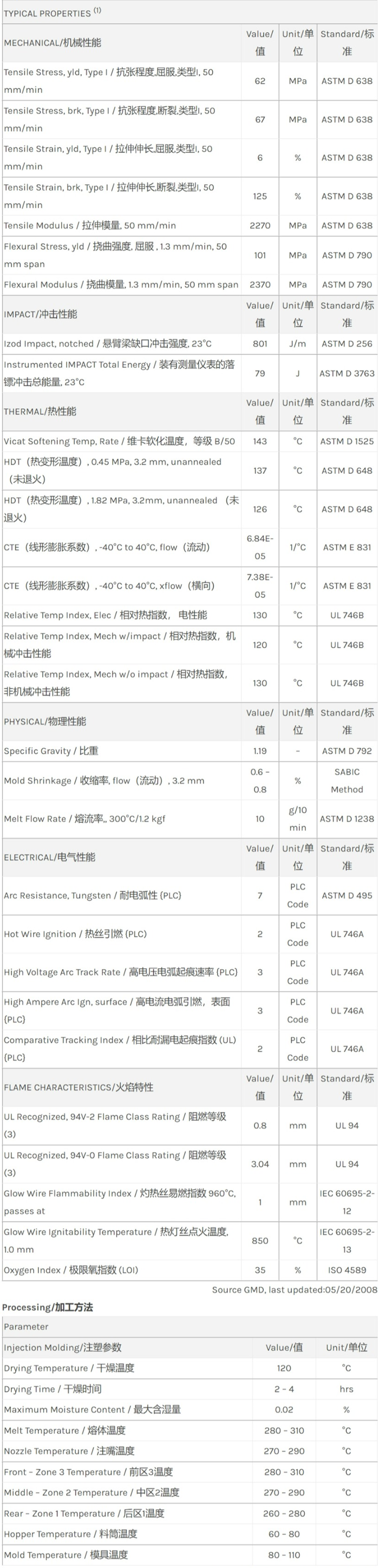 应用范围: 产品描述 Lexan PC 945A物性表 “Lexan 945A resin 是一种聚碳酸酯(PC)产品。它可以通过注射成型进行处理。 特性包括: 阻燃/额定火焰 无卤素”。 相关颜色色号:945A-GY2E364T、945A-116、945A-111N、945A-BL5D091T、945A-7T1D059T、945A-YW7G027X、945A-GY2C135T、945A-RD