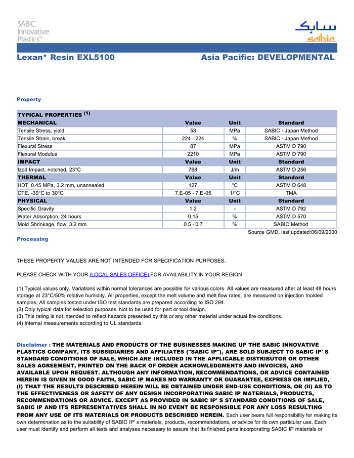 应用范围: 产品描述 LEXAN PC EXL5100物性表