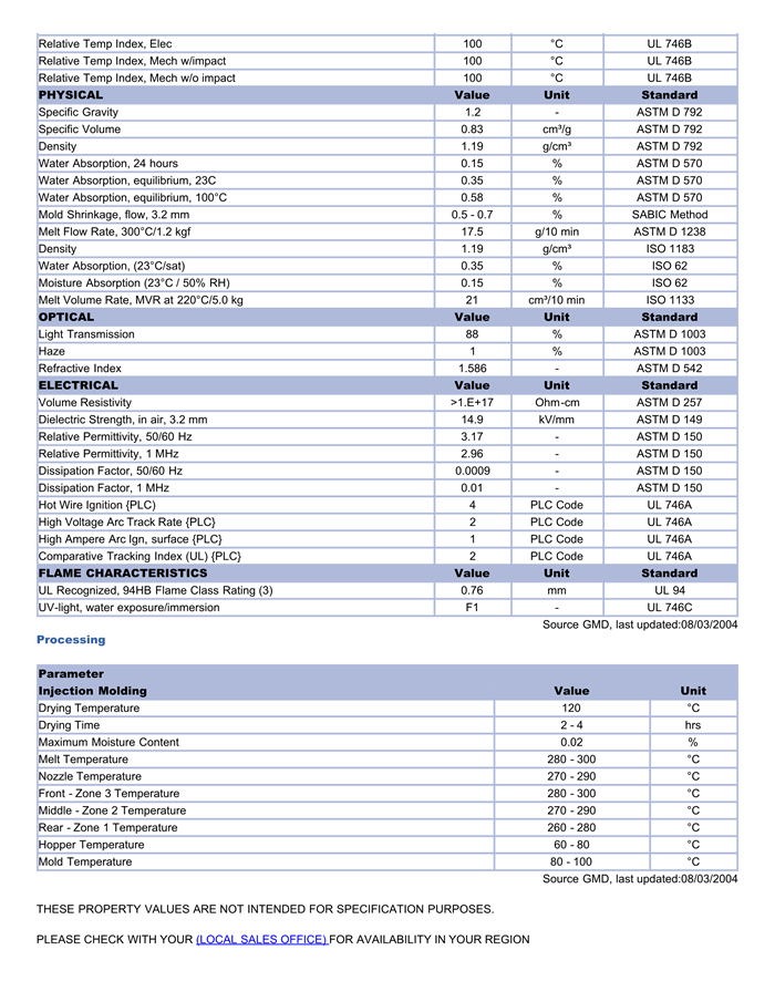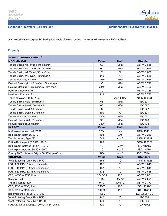 应用范围:产品描述LEXAN PC LI1813R物性表Low-viscosity multi-purpose PC having low levels of ionics species. Internal mold release and UV-stabilized.