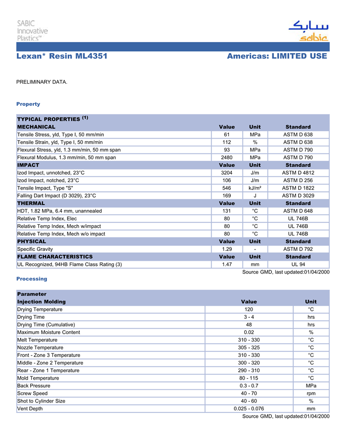 LEXAN PC ML4351物性表