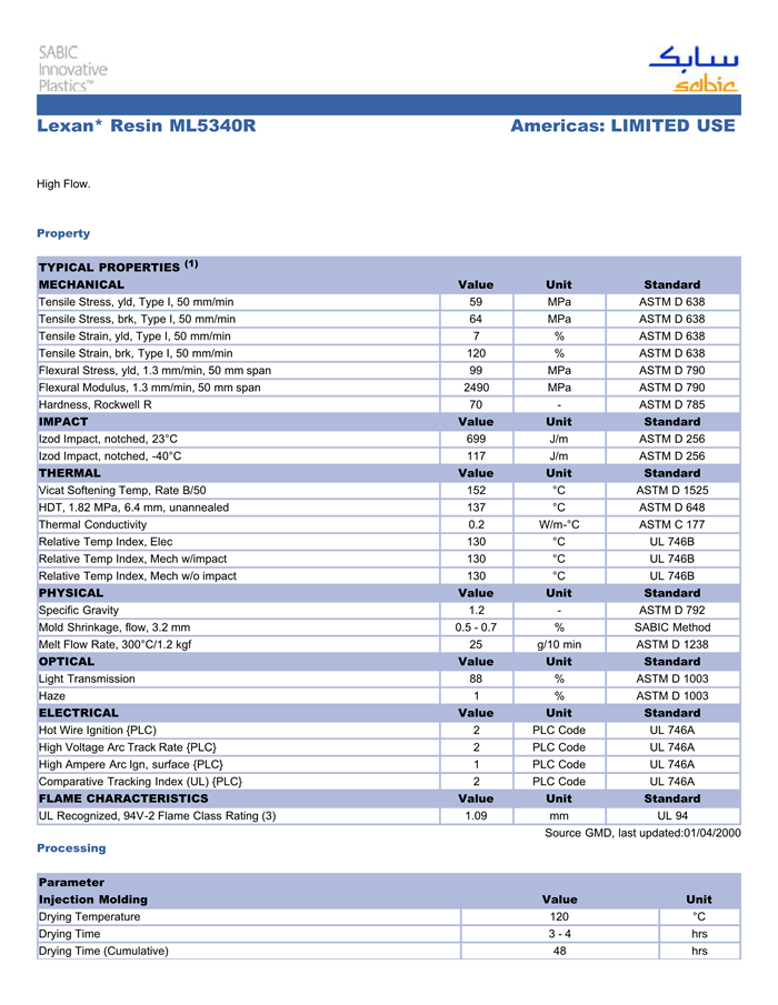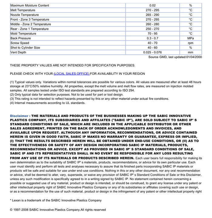 应用范围:产品描述LEXAN PC ML5340R物性表High Flow.