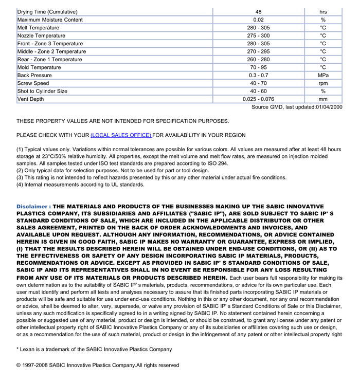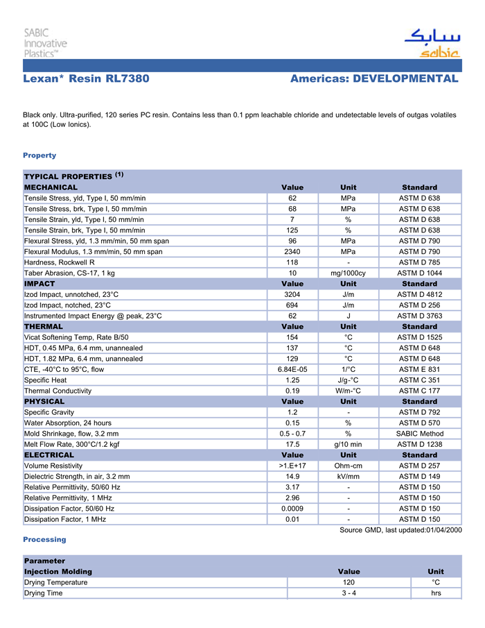 应用范围:产品描述LEXAN PC RL7380物性表Black only. Ultra-purified, 120 series PC resin. Contains less than 0.1 ppm leachable chloride and undetectable levels of outgas volatiles at 100C (Low Ionics).