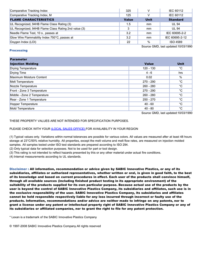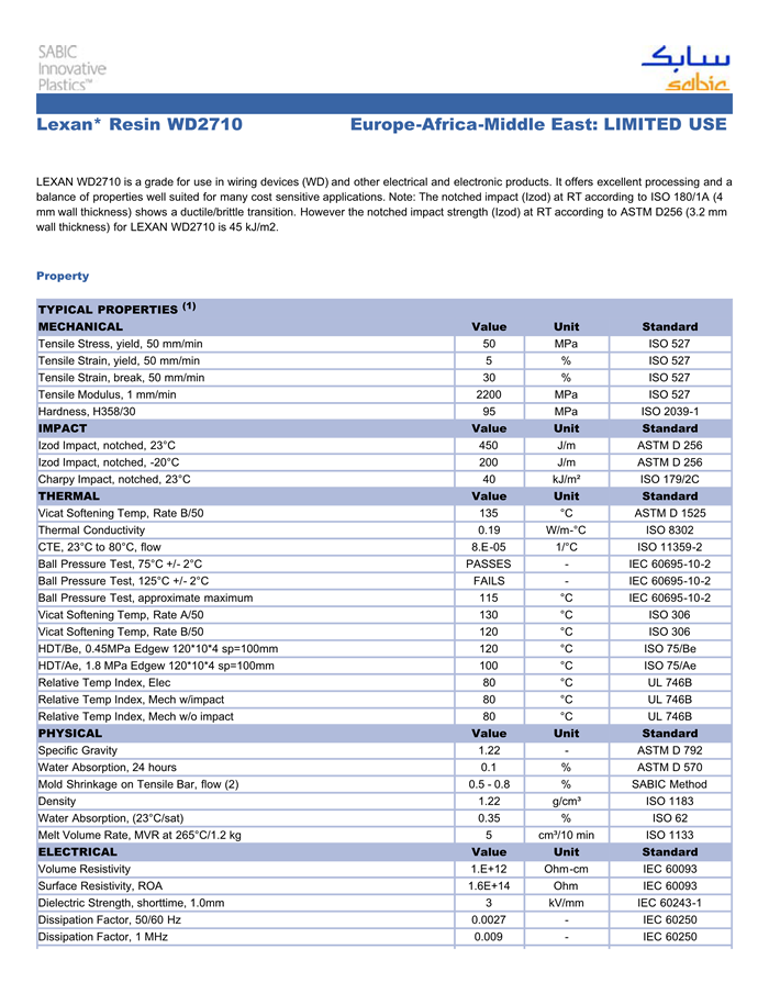 LEXAN WD2710 is a grade for use in wiring devices (WD) and other electrical and electronic products. It offers excellent processing and a balance of properties well suited for many cost sensitive applications. Note: The notched IMPACT (Izod) at RT according to ISO 180/1A (4 mm wall thickness) shows a ductile/brittle transition. However the notched IMPACT strength (Izod) at RT according to ASTM D256 (3.2 mm wall thickness) for LEXAN WD2710 is 45 kJ/m2.